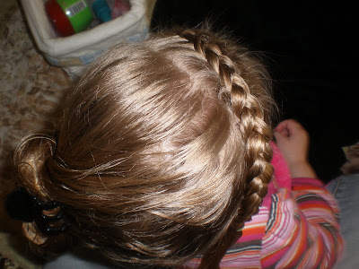 I think the inside-out french braid is much easier than a regular french braid & looks much cuter. Here's what we came up with today: